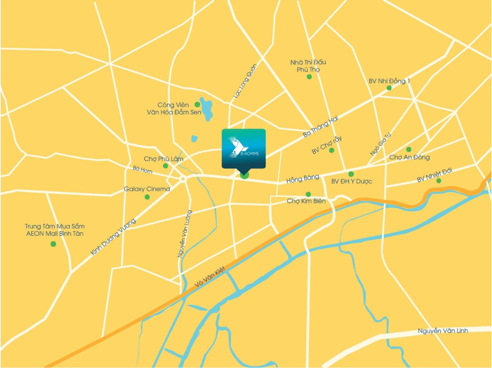 - Căn hộ D-Homme có vị trí đắc địa nằm ngay khu trung tâm thương mại sầm uất, nơi mà có rất nhiều người Hoa sinh sống. Hơn nữa, còn nằm ở nơi giao lộ 3/2 – Hồng Bàng – Minh Phụng, là nơi hội tụ đủ các điều kiện thuận lợi về cả kinh tế, giao thông lẫn đời sống sinh hoạt.