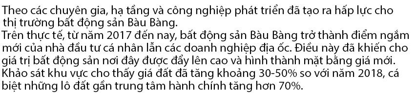 Bàu Bàng đang được “thay da đổi thịt” bằng sự đột phá về hạ tầng theo hướng liên kết vùng. Ngoài quốc lộ 13 nối liền TPHCM với Bình Phước và các tỉnh Tây Nguyên, Bàu Bàng còn có đường Vành đai 4, đại lộ Mỹ Phước – Tân Vạn, ĐT 749 giúp kết nối thông suốt với các cảng biển quốc tế, khu công nghiệp trong vùng kinh tế trọng điểm phía Nam.