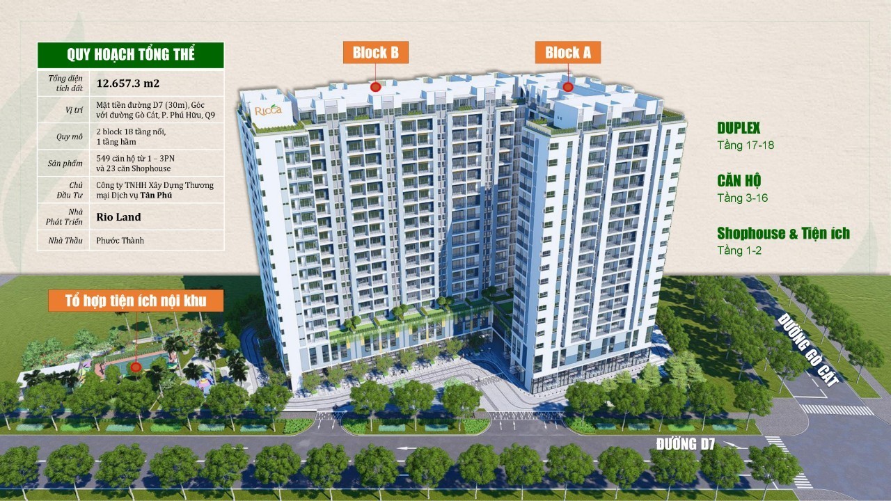 Tọa lạc tại vị trí trung tâm Q.9, Ricca có quy mô 2 tòa tháp cao 18 tầng, bao gồm 549 căn hộ từ 1 đến 3 phòng ngủ và 23 căn thương mại dịch vụ trên tổng diện tích 12.657.3 m2. Dự án do Công ty TNHH Xây dựng TMDV Tân Phú làm chủ đầu tư, cùng tổng thầu xây dựng là công ty Phước Thành – thương hiệu uy tín gắn liền với nhiều công trình nhà ở tại TP.HCM.